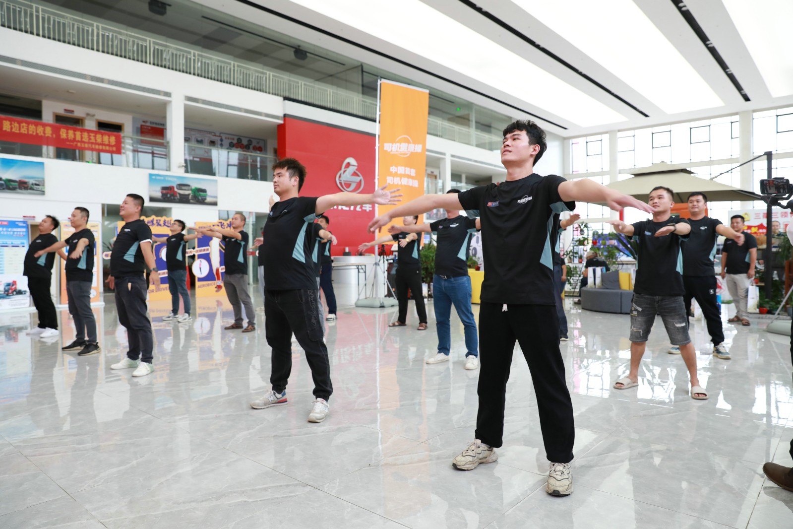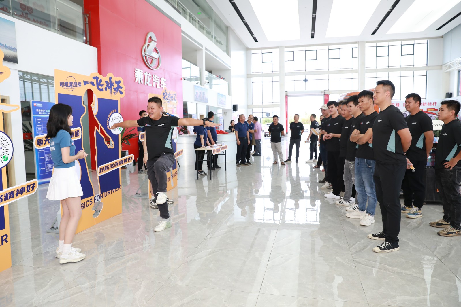 隨后,司機朋友觀看了司機健康操主題視頻和初衷視頻,進一步加深了大家對司機健康操的了解。在實操體驗環節,司機朋友踴躍上臺,并在推廣大使的帶領下,認真做起了司機健康操:左右旋轉伸展、踮腳雙臂后伸、臂平展單腿站……全場笑聲朗朗,熱鬧非凡。